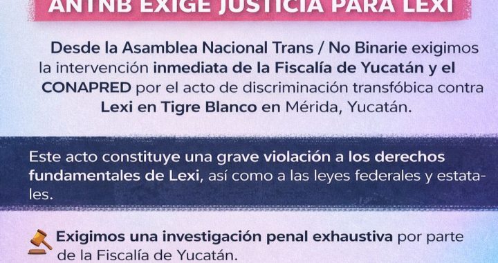 3 de abril de 2026 La Asamblea Nacional Trans No Binarie (ANTNB), ante los hechos denunciados públicamente por la mujer trans Lexi respecto de un presunto acto de discriminación, exclusión … Sigue leyendo EXIGIMOS INTERVENCIÓN INMEDIATA DE LA FISCALÍA GENERAL DEL ESTADO DE YUCATÁN Y DEL CONAPRED ANTE LA DENUNCIA DE DISCRIMINACIÓN Y VIOLENCIA CONTRA LEXI EN MÉRIDA